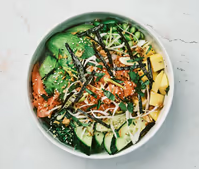 gurka, mango, sojabönor, ingefära sjögrässallad, chilimajonnäs, rostad lök & purjolök