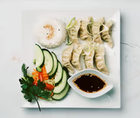 Degknyten fyllda med, kyckling/räkor/vegetariskt med ris, sallad och dumplingssås